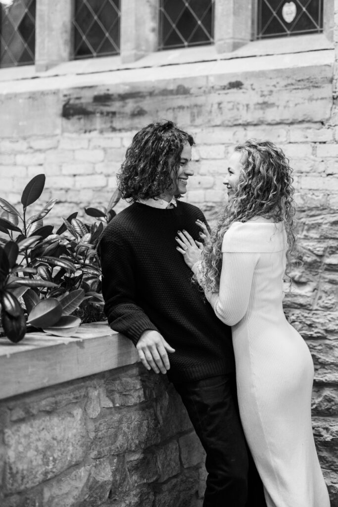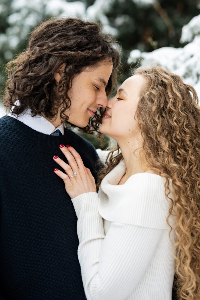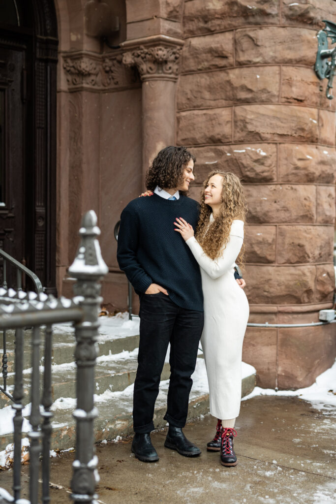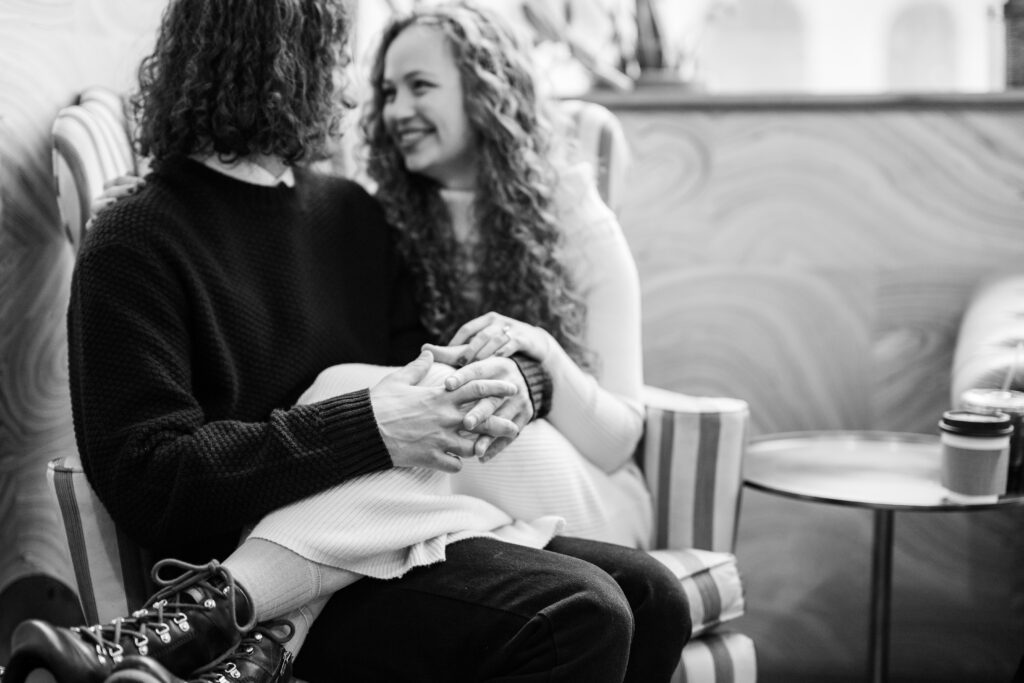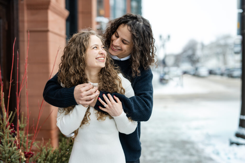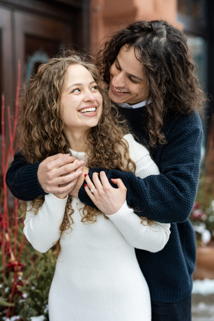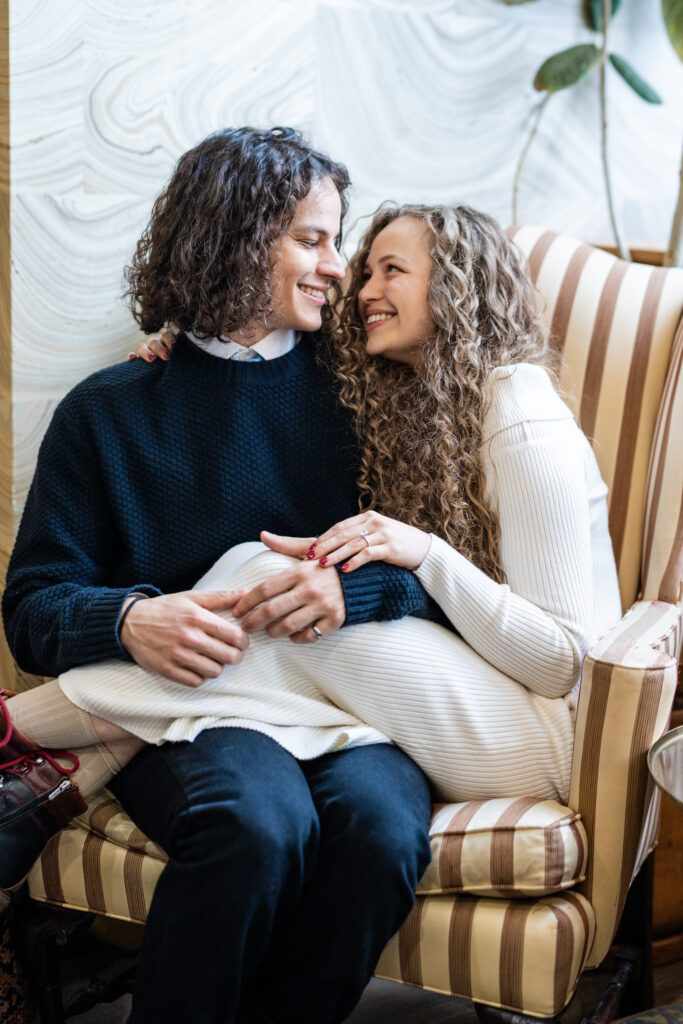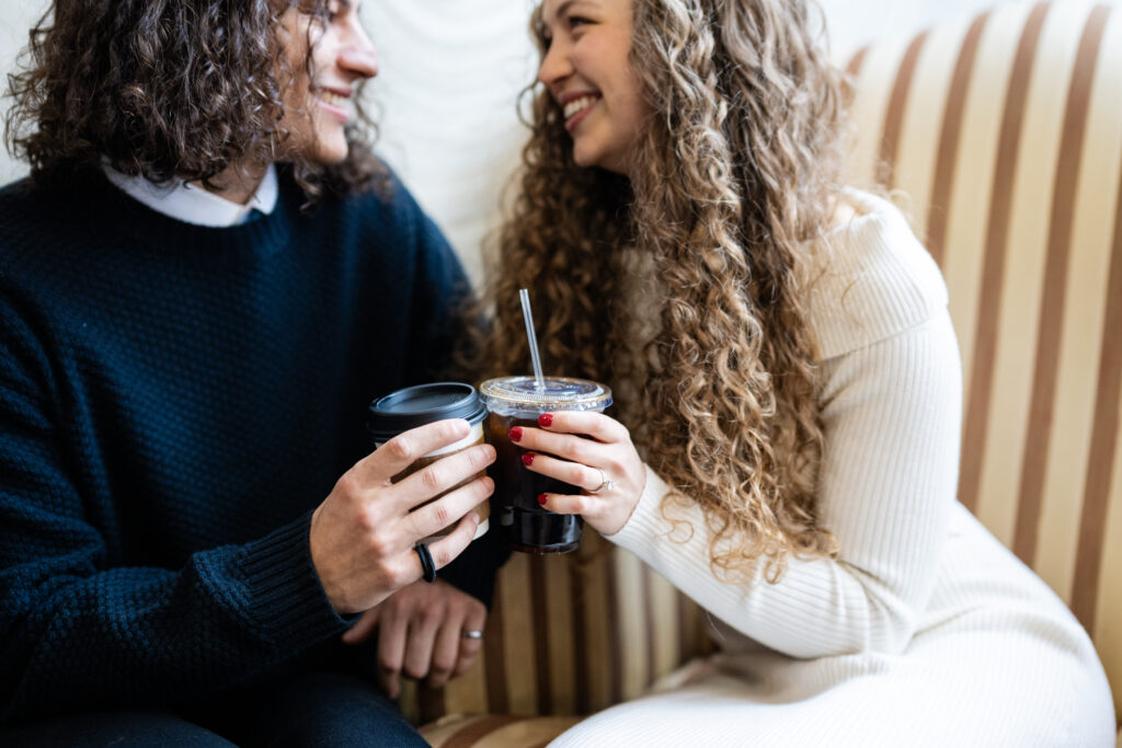 Engaged couple at coffee shop looking at each other